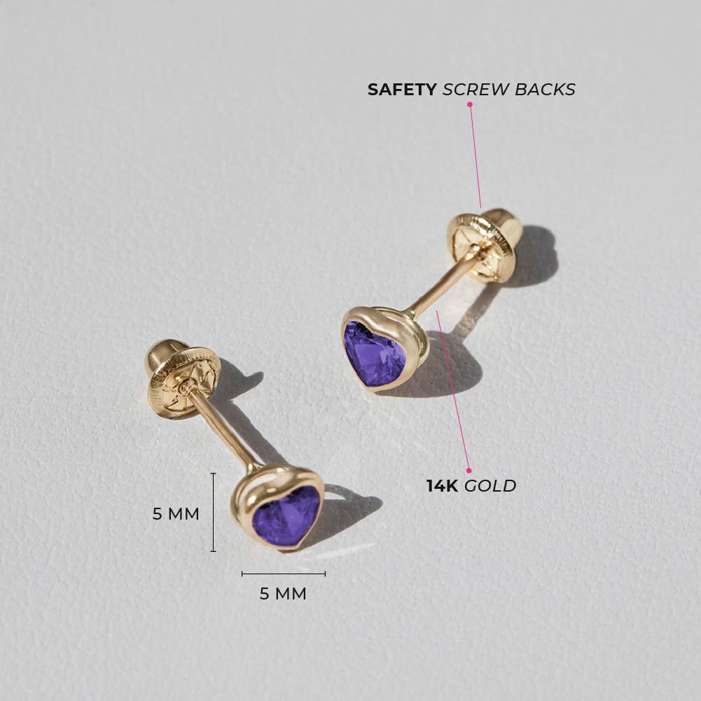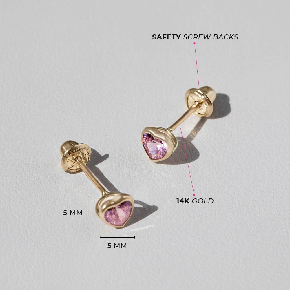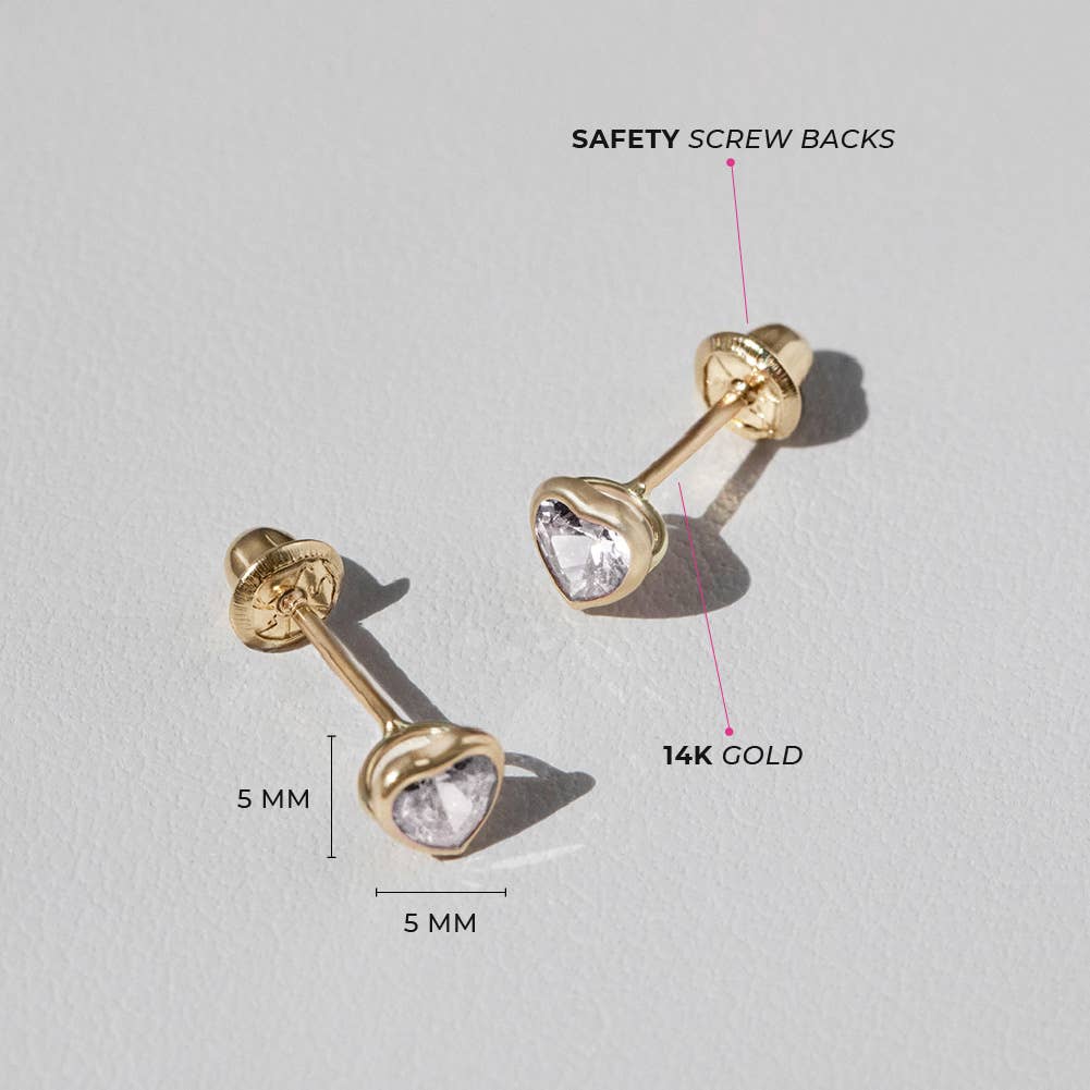 This sweet pair of small screw back earrings for girls are crafted entirely of 14k yellow gold and adorned with a stunning heart cubic zirconia stone in a bezel setting. Equipped with screw backs they will stay safely in place and your little girl will be super comfortable wearing them all day and night. A meaningful fine jewelry gift for a loved one, packaged into their own little Window Box for your convenience.